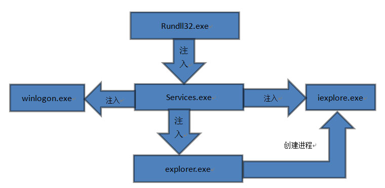 此次瑞星公司公布的病毒分析報告顯示,“超級火焰”病毒的主體為一個名為MSSECMGR.OCX的DLL動態(tài)庫,通過命令行“rundll32.exe MSSECMGR.OCX, DDEnumCallback”來實現(xiàn)病毒的加載。病毒運行后會將自身復(fù)制到System32目錄下,并向services.exe、winlogon.exe、explorer.exe和iexplore.exe等程序中注入自身并實現(xiàn)加載。該病毒的注入流程如下圖所示。