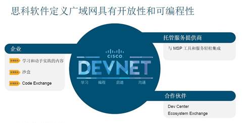 除了提供卓越的安全和應用體驗外,思科SD-WAN還具備開放性與可編程性。曹圖強表示,“首先,思科將通過 DevNet 開發(fā)平臺向所有用戶開放API,為開發(fā)人員提供更大價值;其次,對合作伙伴而言,思科希望提供一個可交互的平臺幫助用戶進行分享。任何用戶有特殊的需求,可以在DevNet 與大家分享。具體來說,在整個安全的廣域網部署中, IT人員可以通過開放的平臺,根據(jù)不同的環(huán)境和需求進行二次開發(fā)!