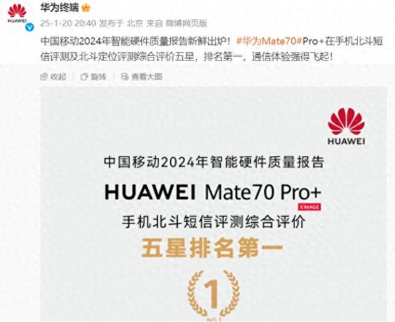 1月20號,據(jù)中國移動2024年智能硬件質(zhì)量報告顯示,華為Mate70 Pro+在北斗短信和北斗定位兩項評測中雙雙拿下了第一名,展現(xiàn)出非常強的技術和實力。這款搭載雙衛(wèi)星通信技術的旗艦機,到底有什么過人之處?