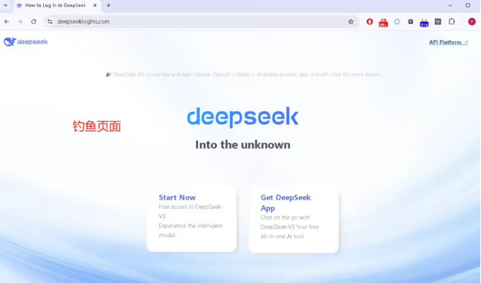 以釣魚網(wǎng)站“https://deepseeklogins.com/”為例,其頁(yè)面結(jié)構(gòu)和風(fēng)格與 DeepSeek 官方網(wǎng)站高度相似,旨在通過偽造官方頁(yè)面來誘導(dǎo)用戶泄露敏感信息。與真實(shí)網(wǎng)站相比,釣魚頁(yè)面移除了中英文切換的超鏈接。在該釣魚頁(yè)面中,點(diǎn)擊右上角的“API Platform”鏈接將會(huì)引導(dǎo)用戶跳轉(zhuǎn)到偽造的登錄頁(yè)面。