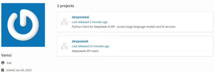 2025 年 1 月 29 日,用戶 bvk(該賬戶于 2023 年 6 月創(chuàng)建,且無其他活動(dòng)記錄)在 Python 軟件包索引(PyPI)上傳了兩個(gè)軟件包:“deepseeek”和“deepseekai”。