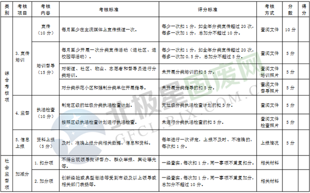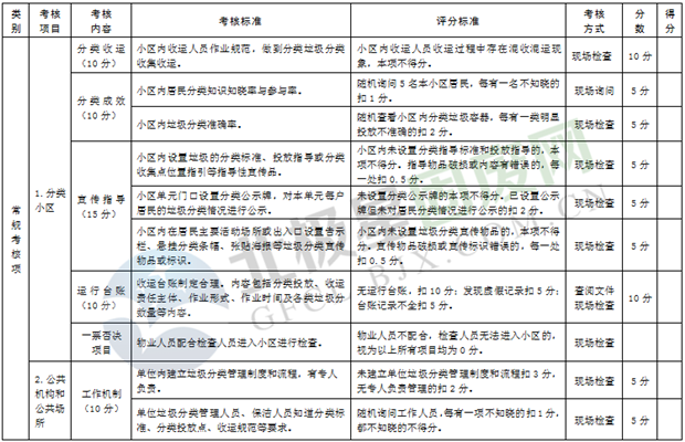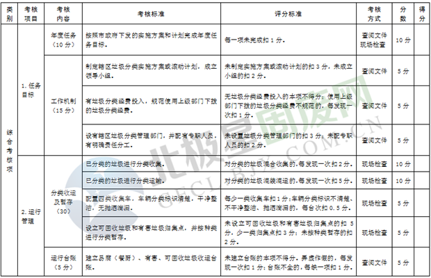 綜合考核:主要是考核各區(qū)市縣制度建設(shè)、運行管理、宣傳培訓(xùn)、信息報送和日常檢查執(zhí)法等情況,由市垃圾分類工作領(lǐng)導(dǎo)小組人員采取現(xiàn)場檢查和資料查閱等方式進行。