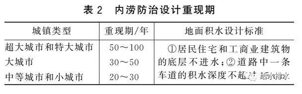 《Urban Storm Drainage Criteria Manual》對于內(nèi)澇防治設(shè)計重現(xiàn)期時的道路積水有詳細(xì)規(guī)定,我國《室外排水設(shè)計規(guī)范》有類似規(guī)定,見表2。