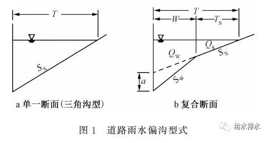 道路雨水偏溝主要有2種型式:單一斷面和復(fù)合斷面(見圖1)。出于計算簡便的需要,僅介紹單一斷面(三角溝型)的計算方法。