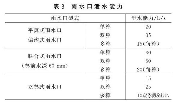 國家標(biāo)準(zhǔn)圖集《雨水口》(16S518)提供了一個在一定水力條件下(道路縱坡0.3%~3.5%,橫坡1.5%,箅前水深40 mm)通過1∶1的水工模型經(jīng)過試驗確定的不同型式雨水口泄水能力,如表3所示。