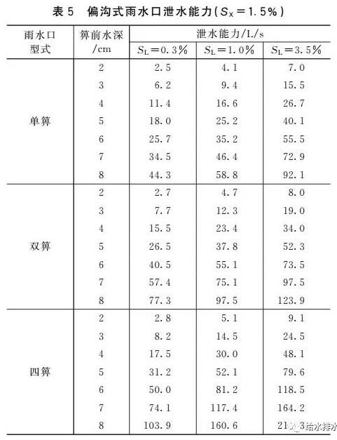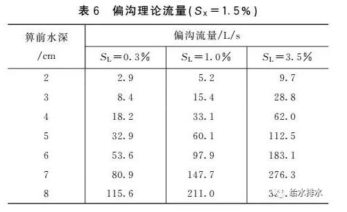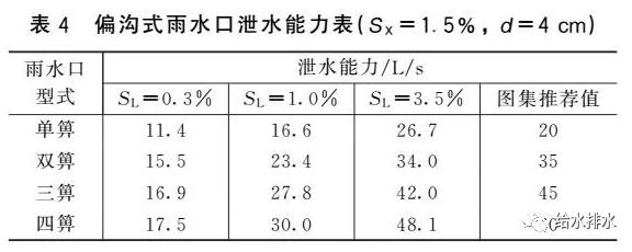 (1)雨水口泄水能力不應(yīng)超過其偏溝流量,而我國標(biāo)準(zhǔn)圖集泄水能力推薦值卻超過了偏溝流量。對于箅前水深、道路橫坡和縱坡一定的偏溝式雨水口,其偏溝流量是固定的(見表6)。對于箅前水深4 cm的偏溝式雨水口,偏溝式雨水口泄水能力不應(yīng)大于18.2 L/s(SL=0.3%)、33.1 L/s(SL=1.0%)、62.0 L/s(SL=3.5%),這和箅子數(shù)量無關(guān)。