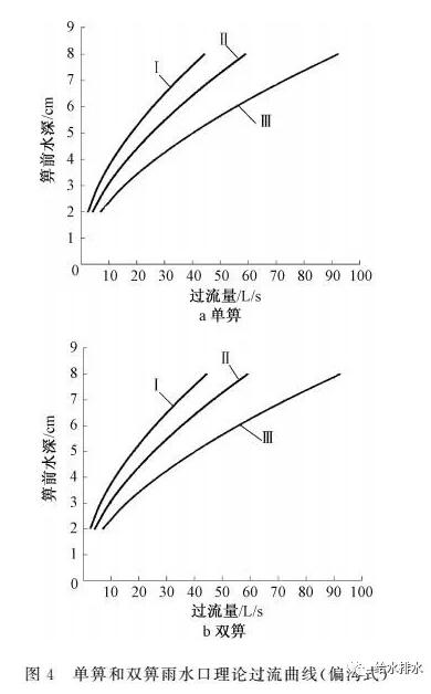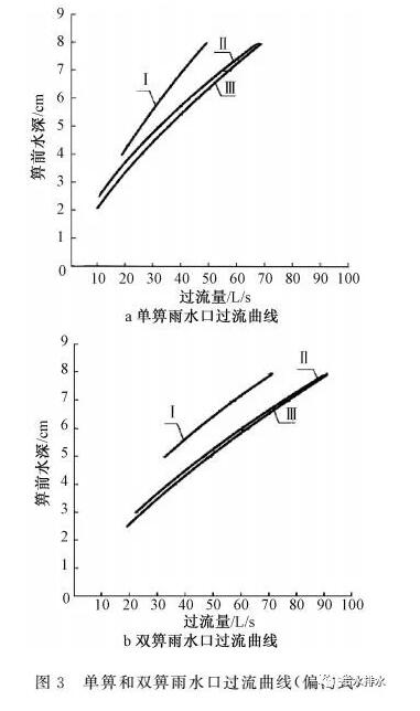 當(dāng)箅前水深大于40 mm時,圖集還提供了雨水口過流曲線圖供設(shè)計人員查找,見圖3。圖中Ⅰ、Ⅱ、Ⅲ型分別為道路縱坡0.3%、1.0%和3.5%。