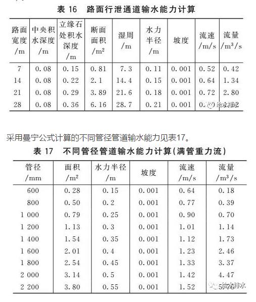 采用曼寧公式計算的路面行泄通道輸水能力見表16(假設(shè)機(jī)動車和非機(jī)動車道寬度均為3.5 m)。