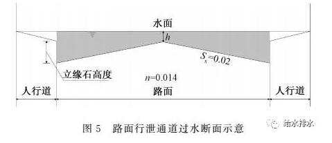 輸水能力計算圖5為路面行泄通道過水?dāng)嗝媸疽狻3鲇谟嬎愫喕鹨?,不考慮道路中央分隔帶和機(jī)非隔離帶對過水?dāng)嗝娴挠绊懀膊豢紤]超出道路機(jī)動車道和非機(jī)動車道范圍內(nèi)的過水?dāng)嗝?。根?jù)表2中規(guī)定,至少一條機(jī)動車道積水不能超過15 cm,假設(shè)機(jī)動車道寬度為3.5 m,則圖5中道路中央積水深度h=0.15-3.5×0.02=0.08(m)。