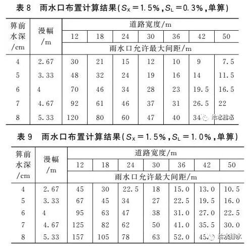 (4)如果以國家標(biāo)準(zhǔn)圖集《雨水口》中的箅前水深4 cm(SX=1.5%,SL=0.3%)作為雨水口布置的依據(jù),那么對于寬度大于等于18 m的道路,其雨水口允許最大間距均小于國家規(guī)范推薦值(25~50 m)。