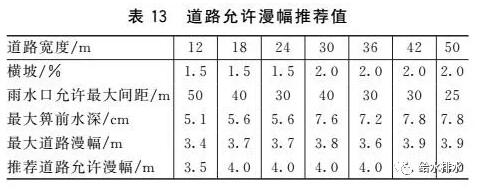 我國尚無明確的道路漫幅規(guī)定,建議有關(guān)部門盡快制定相關(guān)的標(biāo)準(zhǔn)。在相關(guān)標(biāo)準(zhǔn)未出臺前,設(shè)計人員計算時采用的道路漫幅可參考表13推薦值。