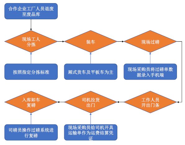 中再環(huán)服根據(jù)供應(yīng)商要求的不同,分別采取參與投標(biāo)或協(xié)商談判的方式與之簽訂回收合同或框架協(xié)議。中再環(huán)服采用預(yù)付款的形式支付采購(gòu)款項(xiàng),預(yù)估月采購(gòu)金額提前支付半個(gè)月或一個(gè)月的預(yù)付款,在收到供應(yīng)商預(yù)付款補(bǔ)充通知后及時(shí)補(bǔ)足預(yù)付款項(xiàng)。具體回收流程如下: