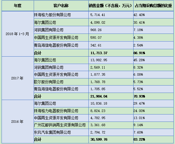 3、和大型知名企業(yè)的合作協(xié)議都簽到了2021年,穩(wěn)定性肯定沒(méi)問(wèn)題:“中再環(huán)服與海爾集團(tuán)、格力電器、東風(fēng)汽車(chē)均維持多年合作關(guān)系,歌爾股份雖為2017年新增客戶,但雙方已簽訂了截至2021年的長(zhǎng)期合同,各大供應(yīng)商均對(duì)中再環(huán)服有較高的認(rèn)可度。因此,中再環(huán)服與上述大型企業(yè)建立的合作關(guān)系是可持續(xù)的。”